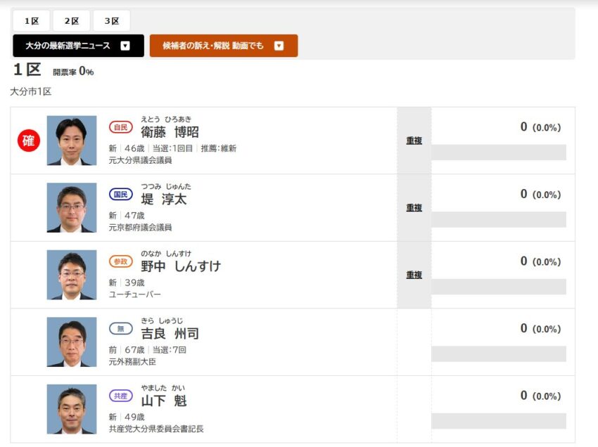 最も信頼できるNHKで大分1区に当選確実が出ました。(最も早かったのはOBSは20時台)。