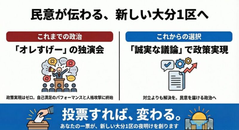 国民民主党大分県連が大分1区に候補者擁立を決定しました。民意を伝える気がない「オレすげー」の議員活動を繰り返していた吉良州司議員落選運動が開始します。