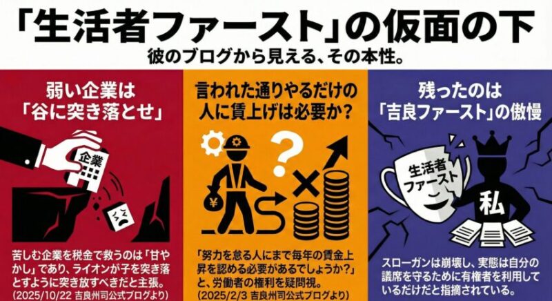 いま皆さんが剥ぎ取るべきは、吉良氏が被っている「生活者ファースト」という薄っぺらな仮面です。その裏側に隠されているのは、弱者を踏みつけ、努力という言葉で切り捨てる冷酷な優生思想と選民思想そのものです。