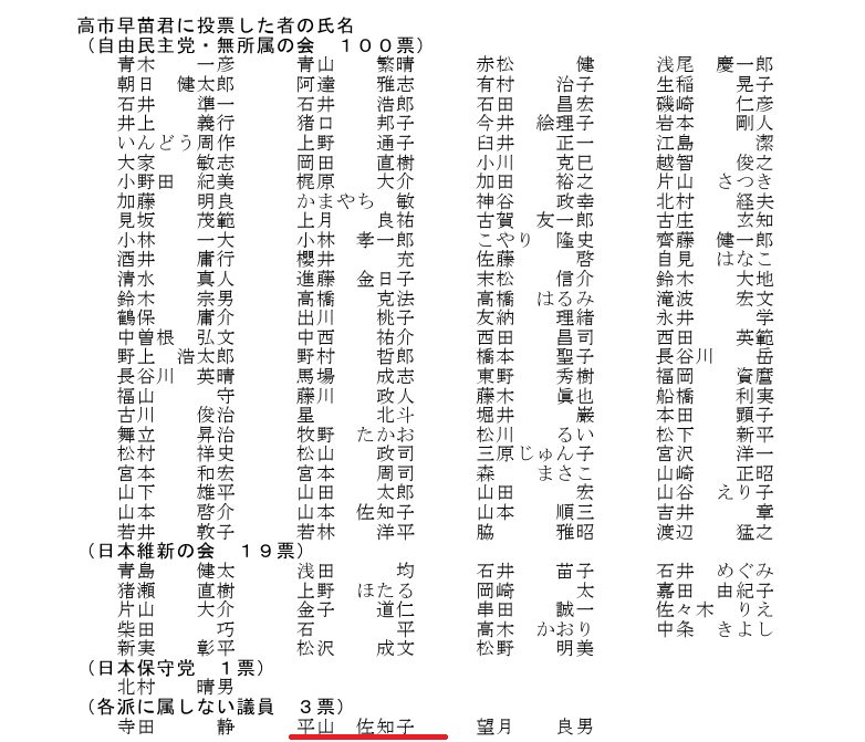 2025年に行われた直近の首班指名選挙。平山佐知子議員は吉良州司氏ではありません。高市早苗現首相に投票しました。