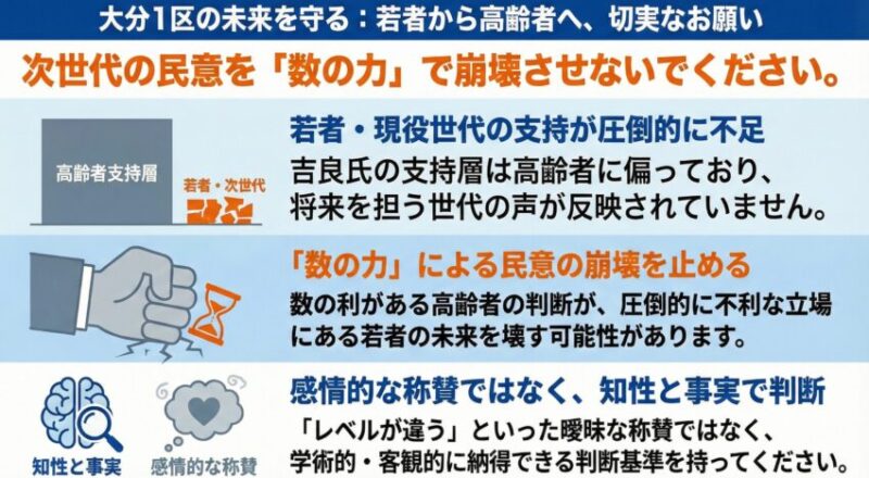 吉良氏の自画自賛を担ぎ、適当なことを言って、私たち若い世代がようやく意志を持つようになった大分1区の民意を崩壊しないでいただきたい。