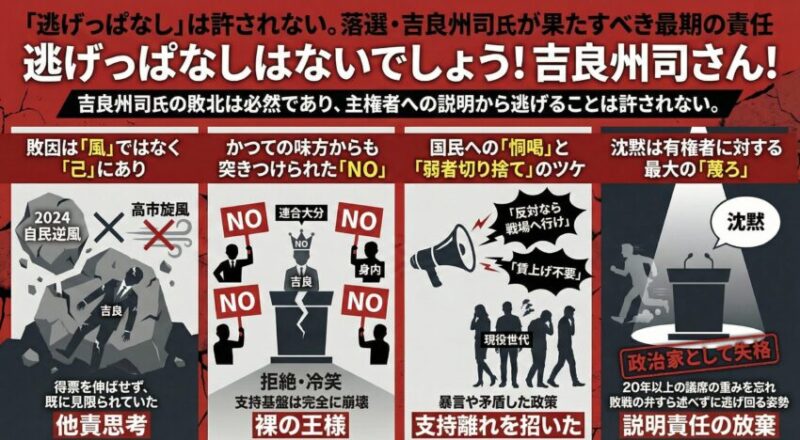 政界を引退するとして、「落選したからこれで終わり」ではありません。公人として、有志の会代表として、そして数々の疑惑から逃げ続けてきた人間として、最後のケジメをつけるべきです。