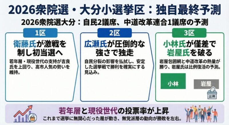 各マスメディアの序盤・中盤・終盤情勢、筆者の独自の調査、そして有力候補者のファイナル集会を取材して、2026衆院選大分小選挙区の最終予測を発表します。